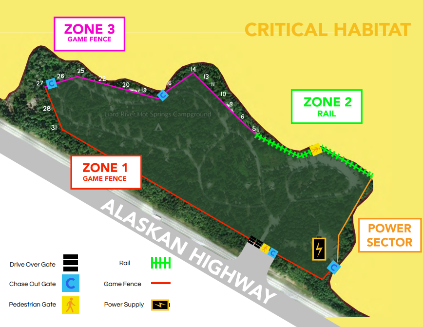 The fence was constructed around the perimeter of the park facilities, camping, and day-use areas, with all visitor parking contained within the fence. As the campground was already constructed, there was little room between the camping pads and the wetland area which is the Department of Fisheries designated critical habitat for endemic snails. Precision surveying, fencing preparation, and 31 direction changes along the fence line allowed construction within these constraints.