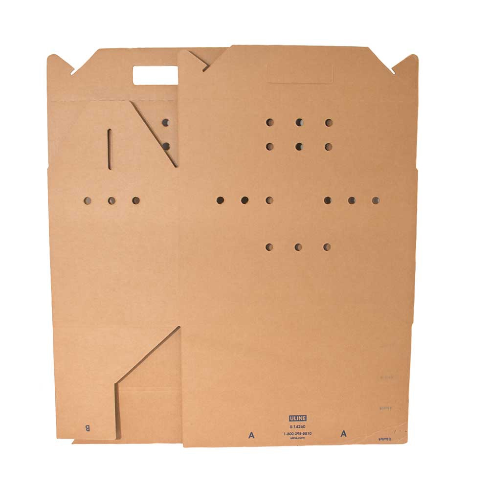 The Cardboard Animal Carrier is a temporary carrier that is excellent for short-term animal or bird handling for spill response situation. Air holes on five sides. Bottom folds in tight and contains handle folds, no need for taping to support closure.