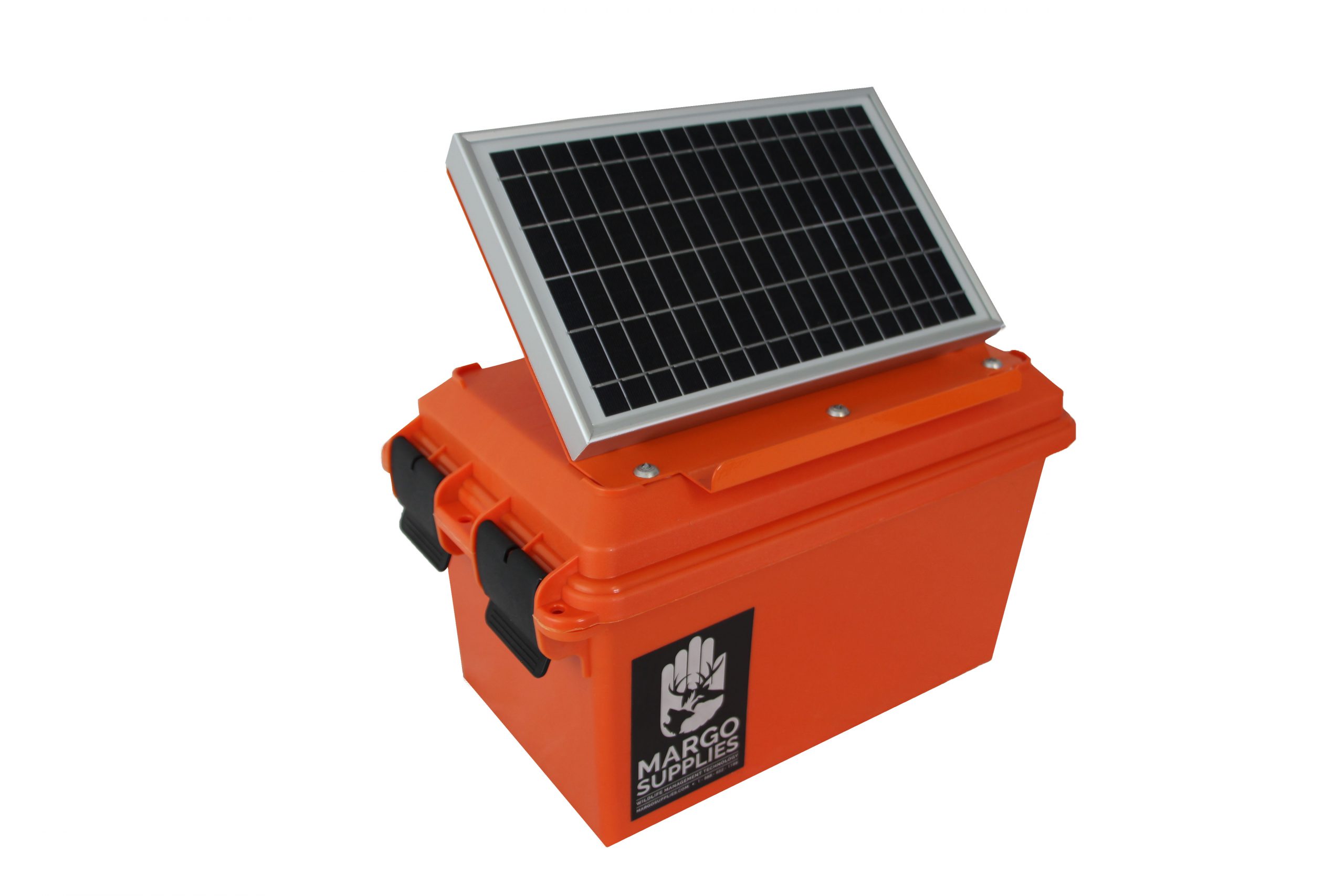Kit includes weather-resistant case, 14Ah gel cell 12v battery, and 5w solar panel.